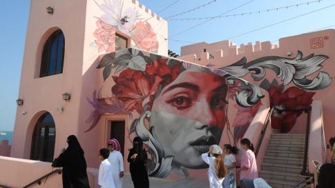 A fotón látható nagy méretű utcai falfestmény (mural) Katara egyik legismertebb színpompás művészeti installációja, közvetlenül a tenger felőli részen, a fő sétány közelében. Katara több épületén találhatók ilyen művészi alkotások, amelyek az utóbbi években váltak a negyed ikonikus elemévé. - Varga Gábor fotója