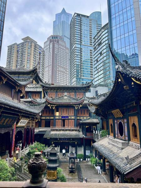 A felhőkarcolók lábánál bújik meg a város legrégebbi, 1000 éves buddhista szentélye, a Luohan templom. Egy békés oázis, melynek legérdekesebb része az 500 szobor csarnoka, ahol több száz életnagyságú agyagszobor pózol különféle arckifejezésekkel.