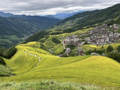 Kuanghszi–Csuang Autonóm Terület: A Longji (Longsheng) rizsteraszok vidéke Guangxiban. A Jinkeng–Dazhai (Tiantou) oldalról készült a fotó: jobbra a hegyoldalba kapaszkodó falvak és vendégházak, balra-hátul a hullámzó, aranyra érő teraszok látszanak. A táj ilyenkor – az aratás előtti időszakban – sárgába borul, és pont ilyen „fodros” mintázatot ad. - B. Kata fotója