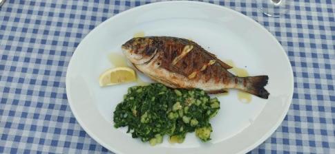 A valuni éttermi tálon egy grillezett tengeri keszeg (orada/dorada) látható, citromgerezddel és kevés olívaolajjal meglocsolva. Köretként a horvát tengerpart jellegzetes ételét, blitvát krumplival (főtt mángold burgonyával, fokhagymával és olívaolajjal) tálaltak mellé. S. J. fotója