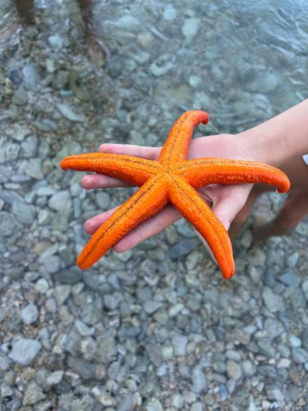 Vörös tengeri csillag (latin neve Echinaster sepositus), amely gyakori Valun környékén is. Ez a faj jellegzetes élénk narancs- vagy vörös színű, öt karja van, és többnyire sziklás, sekély vizekben él. Nem mérgező, de élő példányt mindig érdemes óvatosan visszahelyezni a vízbe, mert fontos szerepet játszik a tengeri ökoszisztémában. - S. T. fotója