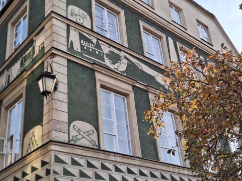A Rynek Starego Miasta (Óvárosi főtér) egyik sarokháza -A varsói óvárosban (Stare Miasto) sok ház hasonlóan gazdag falfestéssel és geometrikus motívumokkal lett helyreállítva a második világháború után. A stílus jellegzetesen varsói: a ház falain a város történelmére utaló díszítések (például ágyúgolyók, bástyák, zászlók) is láthatók, ami szimbolikusan az újjáépítés időszakát idézi. - K.-T. Gyuri fotója