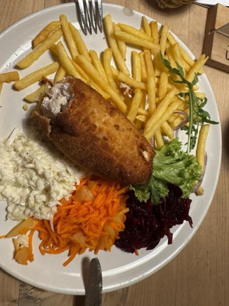 Panírozott csirkemell (kotlet drobiowy), hasábburgonyával és vegyes savanyúságos–majonézes salátákkal (surówki) tálalva, ami tipikus helyi éttermi főétel. - R. K. fotója