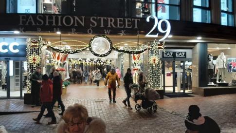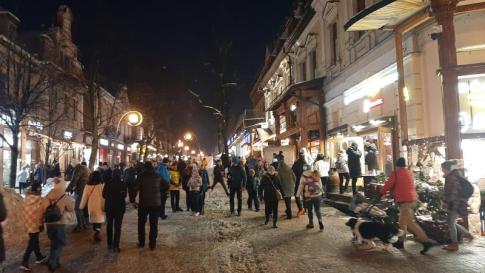 A Krupówki utca hangulatos, ünnepi fényekkel díszített sétálóutcája, tele éttermekkel és ajándékboltokkal.
