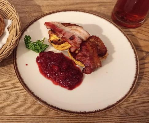 Grillezett oscypek (füstölt juhsajt) szalonnával és áfonyaszósszal tálalva – „oscypek z żurawiną i boczkiem”, amely Zakopane és a Podhale régió egyik jellegzetes helyi specialitása. - F. Cs. fotója