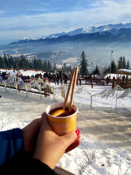Grzaniec, vagyis forralt bor: fűszerezett, melegen felszolgált vörösbor, gyakran narancsszelettel és (itt) fahéjjal. Zakopanéban tipikus téli ital, utcai bódékban és kilátópontokon is árulják. - G. B. fotója
