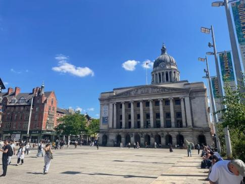 Nottingham központi tere, az Old Market Square: középen a monumentális Council House épületével, amelynek kupolája messziről is a város jelképe. Ez a tér a város szíve, ahol mindig pezseg az élet: itt találkoznak a fő bevásárlóutcák, gyakran tartanak rendezvényeket, és innen könnyű elindulni Nottingham felfedezésére.- aji