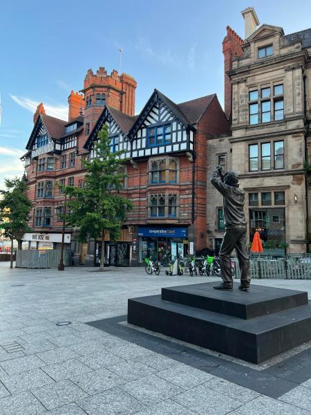 A fotón Nottingham belvárosában, az Old Market Square közelében álló Brian Clough szobor látható. Brian Clough legendás angol futballedző volt, aki a Nottingham Foresttel Európa-kupát is nyert, és a város sporttörténetének egyik legnagyobb alakjaként tisztelik. A szobor a King Street és Queen Street találkozásánál áll, és népszerű találkozási pont a helyiek és a turisták körében. - B. N. fotója