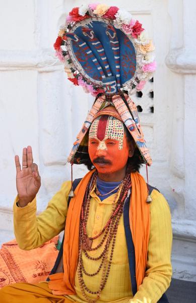 Egy vaishnava szádhu ül áldást osztó kézmozdulattal, arcán díszes festéssel és látványos, kézzel készített fejdísszel. Élénk színei és a több rétegben viselt füzérei a hindu vallási hagyományok szimbolikus elemeit idézik. - Elter Karcsi fotója
