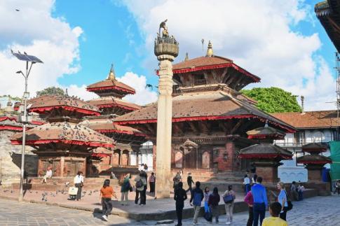 Kathmandu Durbar Square egyik ikonikus része, a palotanegyed pagodatemplomaival és a magas oszlop tetején ülő Garuda-szoborral. Ez a tér a nepáli királyság egykori központja, ma pedig a város egyik legnyüzsgőbb, legfotózottabb történelmi helyszíne. - Elter Karcsi fotója