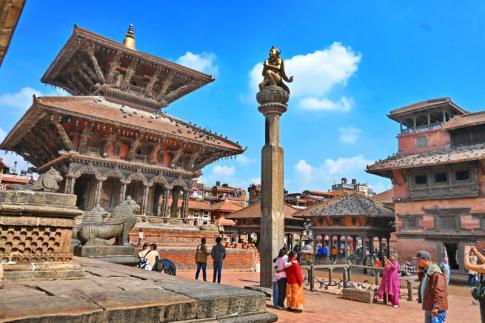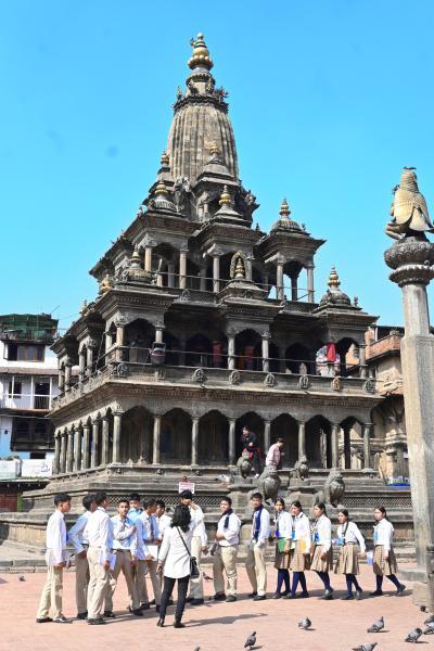 A Krishna Mandir, a Patan Durbar Square legjelentősebb kőtemploma - A 17. században épült szentély egyedülállóan teljes egészében kőből készült, és a királyi palotanegyed egyik legdíszesebb, ikonikus épülete. - Helyi középiskolások művelődnek. - Elter Karcsi fotója