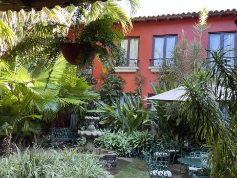 Ez a kép a Hotel Dario bejáratát ábrázolja, amely Granada egyik legszebb koloniális stílusú szállodája a Calle La Calzada sétálóutcán. A kovácsoltvas kapun át látszik a belső udvar szökőkútja és pálmákkal teli árkádos kertje – igazi gyarmati hangulatot árasztó hely.