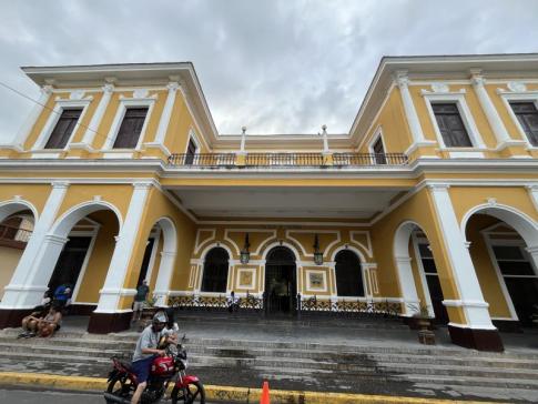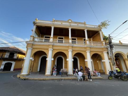 Ez a fotó a Granadai malecón, vagyis a tóparti sétány közelében készült, a Centro Turístico bejáratánál álló sárga, koloniális stílusú épületről. A környéken kis kávéárusok, kerékpárosok és családok töltik a délutánokat, miközben a Nicaragua-tó felől fújó szél hűsíti a levegőt.