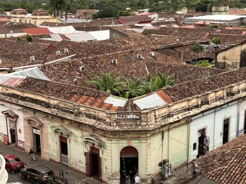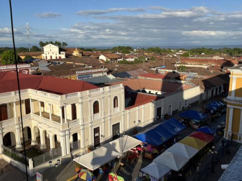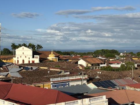 Ugyanott: Innen a város nyugodtabb, kevésbé turistás utcái és a jellegzetes, cseréptetős házak látszanak, valamint a távolban a Nicaragua-tó kékes sávja is feltűnik a horizonton.