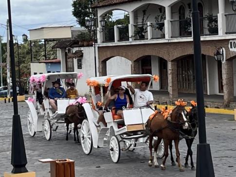 Lovaskocsi várakozik a granadai óváros egyik jellegzetes, koloniális stílusú épülete előtt. A kocsik a város egyik legismertebb látványosságai, amelyekkel a látogatók hangulatos városnézésre indulhatnak. A lovaskocsis városnézés spanyolul “paseo en coche de caballos” vagy egyszerűen “coches de caballos” néven ismert. A 2025-ös árak szerint egy kb. 30–40 perces körút a belvárosban 10–15 USD körül van kocsinként, nem fejenként. A hosszabb, kb. 1 órás túrák, amelyek a tópartig (malecón) is elvisznek, 20–25 USD-ba kerülnek. A sofőrökkel általában spanyolul lehet alkudni, és sokan alapvető angolt is beszélnek. A kiindulópontjuk legtöbbször a Parque Central, a katedrális előtti tér. - K. Kriszta fotója
