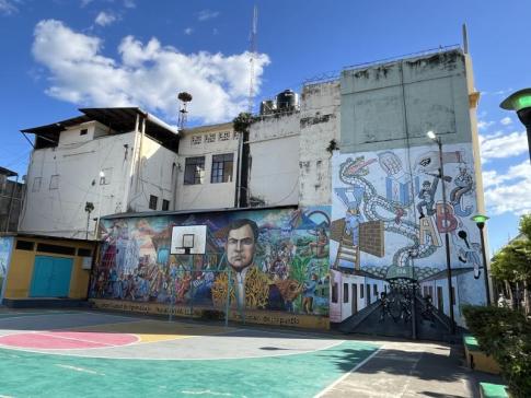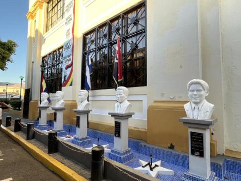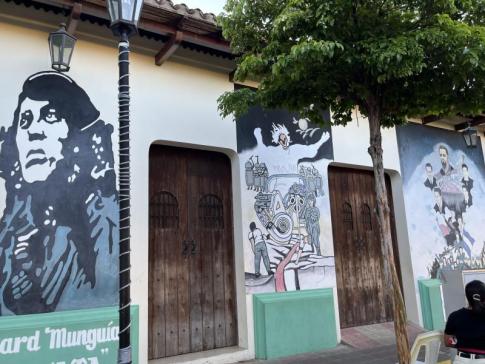 A bal oldali nagy falfestmény középpontjában Rubén Darío, Nicaragua nemzeti költője és León legfontosabb kulturális személyisége látható. Az arcát körülvevő jelenetek a város hagyományait és népi ünnepeit idézik meg. - K. Kriszta fotója