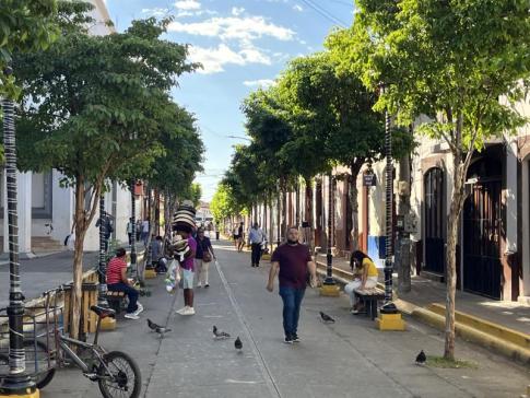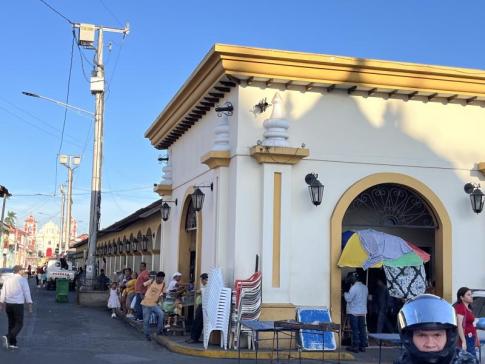 León városának központjában, a Calle Real egyik szakasza, háttérben a Iglesia de La Recolección templommal. A színes, oszlopos homlokzatú épületek és a keskeny, árnyékos utca a város jellegzetes koloniális hangulatát mutatja, amely León történelmi negyedének egyik legfotogénebb része. - Irén fotója