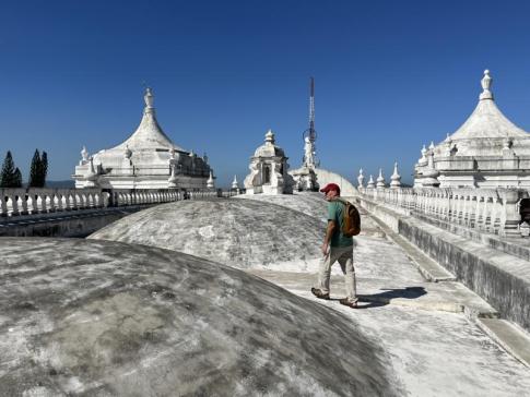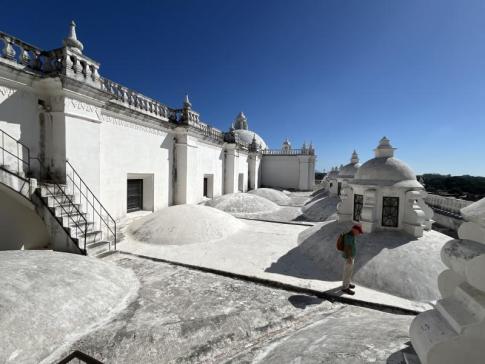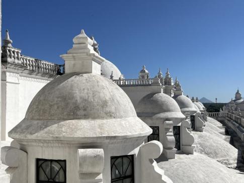 A leóni katedrális (León, Nicaragua) híres fehér tetőteraszán kötelező levenni a lábbelit, mert a hófehér vakolat rendkívül sérülékeny, és a cipők talpa könnyen megkarcolja, megsérti, vagy feketés, gumis nyomokat hagy rajta. A tető anyaga nem kő, hanem egy speciális, több rétegű mész- és gipszalapú bevonat, amelyet a trópusi napsütés még törékenyebbé tesz. Cipővel néhány hét alatt tele lenne csíkokkal és sérülésekkel, ezért engedik csak mezítláb vagy zokniban a turistákat. (A fotón látható magyar utazó erről előre nem tudott, de később figyelmeztették rá.) - K. Kriszta fotói