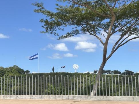 César Augusto Sandino legendás forradalmár (1895-1934) emlékműve az egyeduralkodó párt, a Sandinista Front (FSLN) vörös-fekete és a kék-fehér-kék nemzeti lobogóval - A. J. fotója