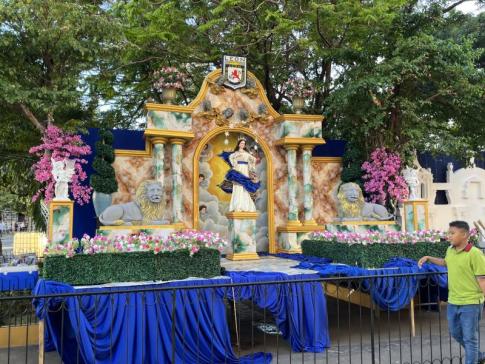A helyi katolikus egyházat amúgy ellenségnek tekintő ateista állampárt hónaljszagú gesztusa a katolikus hívők felé: A Legfelső Biróság is szorgoskodik a fő sugárúton felállított,Szűz Máriás dekorációs soron azzal a felirattal, hogy ,,„Igazság és béke Mária palástja alatt.” - K. Kriszta fotója (2025)