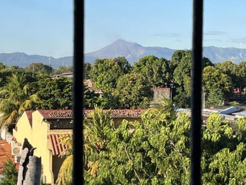 Távolban a Momotombo vulkán csúcsa körül halvány, szürkés füst- vagy gőzcsík emelkedik, ami teljesen tipikus ennél a vulkánnál — időnként gőzkitörések, apróbb aktivitások előfordulnak. - K. Kriszta fotója
