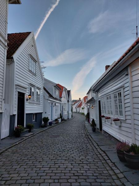 A Gamle Stavanger, vagyis Stavanger óvárosának egy jellegzetes, macskaköves utcája, az Øvre Strandgate, fehérre festett, 18–19. századi faházakkal, virágokkal és cserepekkel díszített házfrontokkal, csendes, hangulatos, történelmi atmoszférával. - S. T. fotója