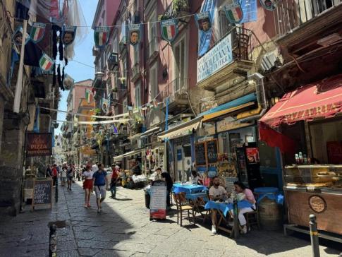 Utunk során megtaláltuk minden pizzák ősét, a híres Brandi pizzériát, ahol állítólag először készítették el a Margherita pizzát, Margherita királynő tiszteletére. Az egyszerű, de ikonikus pizza – paradicsom, mozzarella és bazsalikom (az olasz zászló színei) – innen kapta a nevét. Bár a történet pontos részletei a Wikipédiára tartoznak, annyi biztos, hogy Brandiéknál egy pizzáért 12 eurót kértek, amit nem vállaltunk be. Továbbsétáltunk a szűk sikátorokban, ahol végre ráleltünk a város leginkább nekünk tetsző arcára: igazi nápolyi élet zajlott körülöttünk. Az emberek árukat pakoltak, beszélgettek, gyerekek fociztak, mit sem törődve az ablakokkal vagy a parkoló autókkal.
