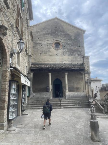 A számomra legmeghökkentőbb élmény a katedrális volt. Kívülről egy letisztult, klasszicista stílusú templomnak tűnik, és a belső tér is puritán, díszítetlen. Azonban ahogy beljebb haladunk, a falakat díszítő szobrok már egészen meglepőek. San Marino lakói híresek a fegyverek iránti rajongásukról, ami ezekben a szobrokban is tükröződik. Legalább egy tucat szobrot számoltam meg, amelyek kezében különféle fegyverek – szigony, kard, dárda, háló, pöröly vagy egyszerű tőr – láthatók. Ez egyedülálló, és egy kicsit bizarr hangulatot kölcsönöz a helynek.