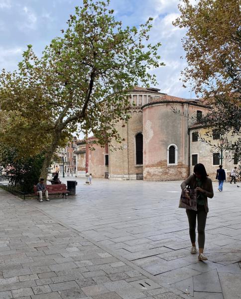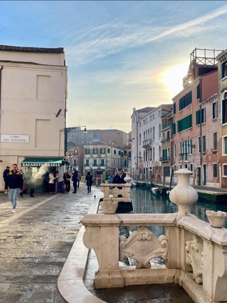 A Campo dei Tolentini téren, közvetlenül a híres Bacareto da Lele nevű apró borozó és borkimérés előtt. Ez a hely egy ikonikus velencei találkozópont, főként a helyiek és az egyetemisták körében, mivel a közelben található a Velencei Egyetem (Ca’ Foscari) egyik campusa. A Bacareto da Lele a város egyik legautentikusabb bacarója, ahol pár euróért kapható panino (kis szendvics) és pohár bor. - T. E. fotója