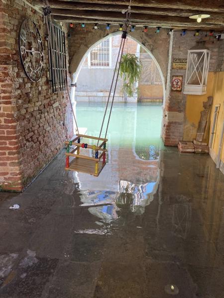 Ez a fotó a Cannaregio negyedben, a Rio della Misericordia vagy a Rio di San Marcuola környékén készült, és egy tipikus vízre nyíló földszinti bejáratot (sotoportego-t) mutat, amelyet épp elöntött a magas vízállás (acqua alta). A jelenet nagyon jellemző erre a városrészre: a Cannaregio-csatorna és a mellékcsatornák mentén sok ilyen alacsony, boltíves átjáró található, amelyek közvetlenül a vízre nyílnak, és gyakran garázs, raktár vagy udvari bejárat funkciót töltenek be. A téglafalak, a díszvilágítás és a vízre lógó hinta egy magánudvar részét mutatják, ami szintén gyakori látvány Velencében. Ez tehát egy lakóház belső udvara avagy átjárója. Ebben a negyedben gyakran fordul elő, hogy a vízszint időszakosan eléri a földszintet. - V. J. fotója