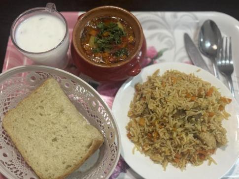 Egy jellegzetes dagesztáni (kaukázusi-orosz) vendéglőben felszolgált ételsor: A pohárban: ayran (savanykás, joghurtalapú ital, frissítő, gyakran kaporral vagy más zöldfűszerrel ízesítve), Felül, a cserépedényben: egy tartalmas lecsószerű zöldséges húsétel (lehet chudu töltelékes változata, vagy inkább egy pörkölt jellegű ragu), friss zöldfűszerrel (pl. korianderrel) megszórva, jobbra, a tányéron: plov (pilaf) – klasszikus rizses húsétel, sárgarépával, hagymával és birka- vagy marhahússal. Ez az egyik legnépszerűbb étel a Kaukázusban is. - Ata fotója