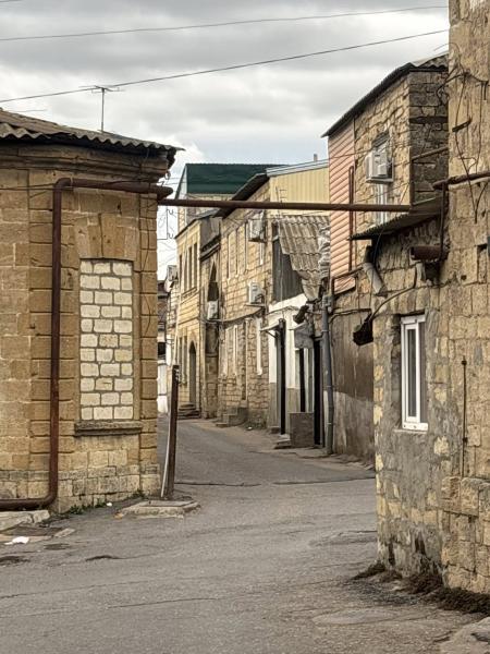 Derbent óvárosának egyik szűk, kanyargós utcája- Az ilyen keskeny sikátorok az ősi városfalakon belüli negyedekre jellemzőek, ahol a házak sárgás kőből épültek, és a falak gyakran még középkori alapokon nyugszanak. Ezekben a negyedekben éltek hagyományosan a város különböző közösségei – perzsák, lezginek, tatok, örmények és zsidók –, így sokféle vallási és kulturális örökség tükröződik az épületekben. A fotón látható utca az ősi zsidó vagy örmény negyed egyik tipikus utcácskája, amelyek ma is megőrzik hangulatukat: keskeny, árnyékos, kissé omladozó, de autentikus és élő városi tér. - Ata fotója