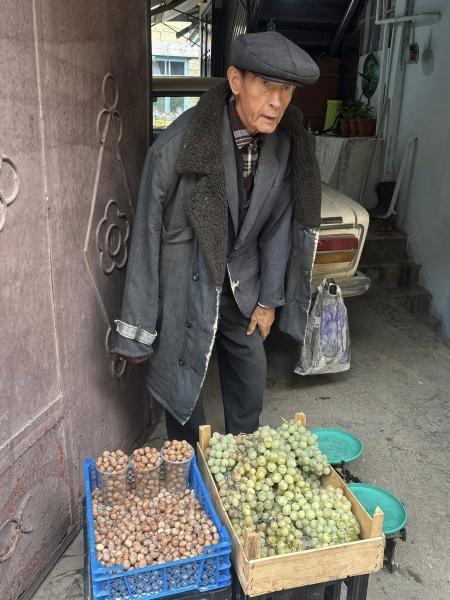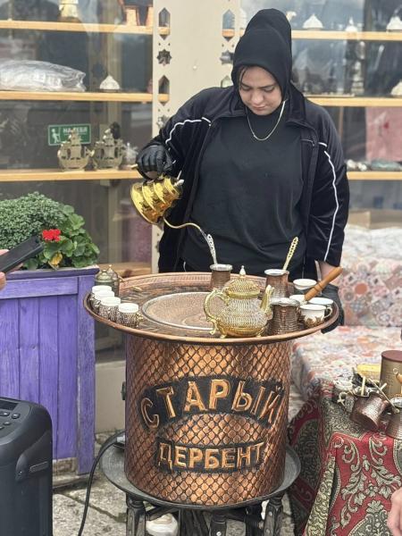 A fotón egy hagyományos dagesztáni utcai teafőző látható, amelyet „samovárként” is emlegetnek, és rajta a „Старый Дербент” (Ó-Derbent) felirat szerepel. A nő ebből szolgál fel frissen főzött teát kis csészékben a járókelőknek. - Ata fotója