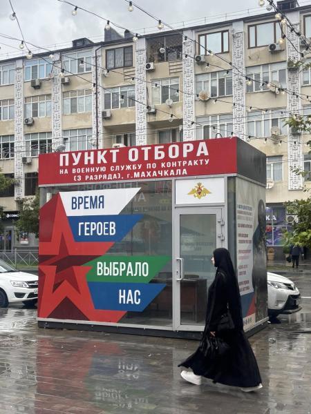 A fotón egy orosz katonai toborzóállomás látható Mahacskalában (Dagesztán fővárosában). A felirat szerint ez egy „Пункт отбора на военную службу по контракту” (szerződéses katonai szolgálatra való kiválasztó pont), az oldalsó szlogen pedig így szól: „Время героев выбрало нас” („A hősök ideje minket választott”). - Ata fotója