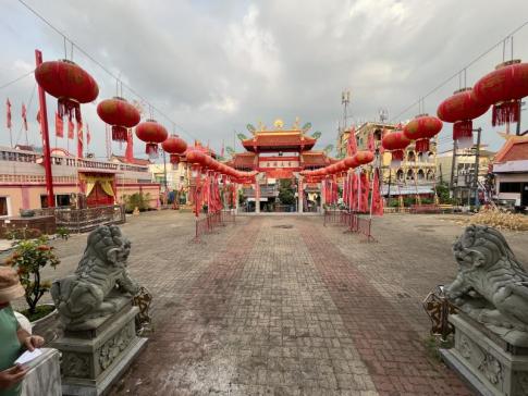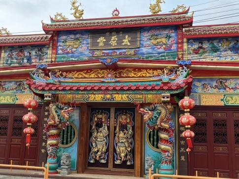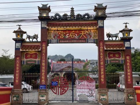 A képen a phuketi óváros egyik híres kínai szentélyének kapuja látható, a Sam Sae Chu Hut Chinese Shrine bejárata. Ez a templom a helyi kínai–thai közösség fontos vallási helyszíne, és több mint száz éve szolgálja a hívőket. A szentélyt a kínai bevándorlók alapították, akik Phuketbe érkezve magukkal hozták saját vallási hagyományaikat és istenségeik tiszteletét. A templom elsősorban a Sam Sae Chu Hut nevű istenségnek van szentelve, akit a közösség védelmezőjeként tisztelnek. A kapu gazdag díszítése – a sárkányok, kínai írásjelek és vörös-arany színek – a hagyományos kínai templomépítészet jellegzetes elemeit mutatja. - K. Kriszta fotója