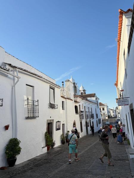"Alentejoban egy fantasztikus napot töltöttünk, melyet a szépséges Evorában kezdtünk. Először körülnéztünk a halpiacon, majd a Sao Francisco Templom csontkápolnájában borzongtunk egyet, a falait ugyanis több mint 5000 szerzetes koponyái és csontjai borítják. Az ezt követő séta már jóval kellemesebb volt. A Világörökségi helyszín pont azt a képet nyújtotta, amit egy portugál kisvárosban látni vágytam: hangulatos házakkal és díszes, macskaköves járdával szegélyezett, kanyargós utca vezetett az impozáns főtérre, ahol a mintás burkolatra a kávézók napernyői vetettek árnyékot. Innen nyílt a széles, szuvenír boltokkal teli sétálóutca, melyek minden épülete képeslapra kívánkozott. Az üzletek parafából készült tálcákat, táskákat, kalapokat és színes kerámia tárgyakat, olajbogyós edényeket kínáltak. A végén, a dombtetőn áll a 12. századi, impresszív katedrális, melynek tornya kilátóként üzemel.