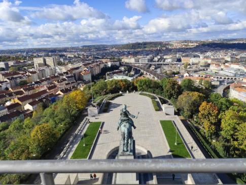 A Vítkov-hegyen (Vrch Vítkov), ahonnan a Nemzeti Emlékmű (Národní památník na Vítkově) és Žižka lovas szobra látható. A hatalmas bronzszobor Jan Žižkát, a híres huszita hadvezért ábrázolja, és a helyről gyönyörű panoráma nyílik Prága központjára, a Moldva folyóra és a Hradzsin felé. - M. H. fotója