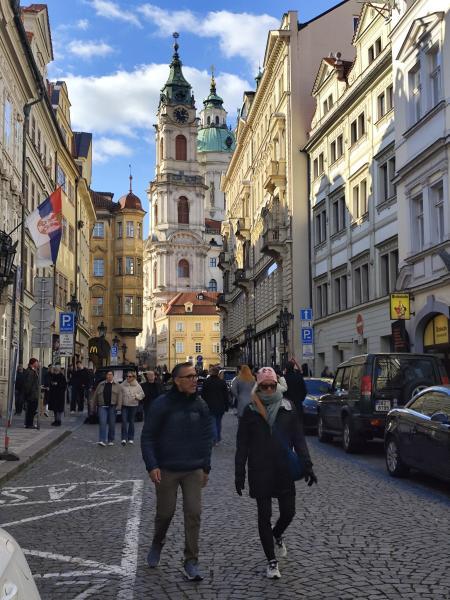 Ez a fotó a Malá Strana (Kisoldal) városrészben készült, a Nerudova utca alsó szakaszán, ahonnan jól látszik a háttérben a Szent Miklós-templom (Kostel svatého Mikuláše) impozáns kupolája és tornya. Ez az utca a Moldva partjától egészen a Hradzsin felé vezet, és az egyik legjellegzetesebb barokk hangulatú sétálóutca Prágában. - H. M. fotója