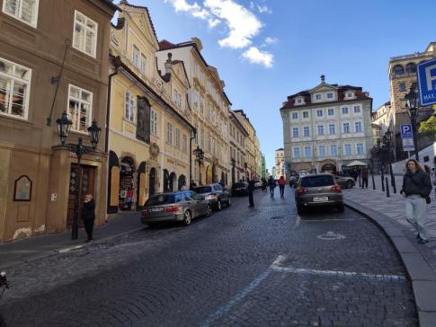 A Malá Strana (Kisoldal) városrészben, a Nerudova utca felső szakaszán, nem messze a Hradzsinhoz (Prágai Várhoz) vezető feljárattól. Jól látszanak a barokk homlokzatú házak, amelyek közül több egykori nemesi palota vagy ma is működő vendéglő, galéria. Ez az utca a Várhegyre vezető egyik legszebb és legforgalmasabb történelmi útvonal, tele kézműves boltokkal és kávézókkal. - H. M. fotója
