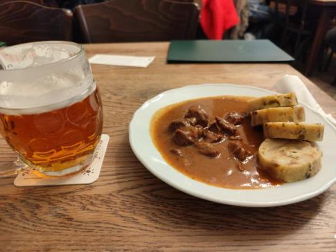 Klasszikus cseh marhapörkölt , azaz hovězí guláš, amelyet hagyományosan kenyérgombóccal (houskový knedlík) tálalnak. Mellette egy korsó cseh világos sör van, amely tipikus kísérője ennek a kiadós, szaftos ételnek. H. M. fotója