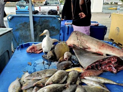 A halpiacon kisebb zátonyhalak (snapper, emperor, grouper-félék), egy nagyobb halfarok és torzó, valószínűleg tonhal vagy kardhal, néhány laposhal vagy rája, valamint egy kócsag, amely a maradékokra vár, avagy azokból próbál csemegézni. - T. G. fotója