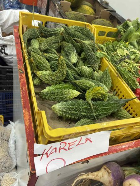 Ez zöld, rücskös termés neve karela, ami más néven keserűdinnye vagy keserűtök (Momordica charantia). Dél- és Délkelet-Ázsiából importálják - Lantos Anikó fotója
