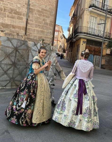 Lányok valenciai népviseletben, pontosabban ez a "traje de fallera", ami hagyományos női ruha a 18. századi valenciai polgári öltözeten alapul, és nagyon díszes. Selyem- vagy brokát anyagból készül, gyakran virágmintás. A szoknya alatt több alsószoknya (enaguas) is van, hogy tartást adjon. A csipkés kötény (delantal) és a vállkendő (mantilla) finom hímzéssel díszített. Ezt a viseletet a Fallas ünnepségek során a nők viselik, amikor virágot visznek a Szűz Mária-szoborhoz (Ofrenda a la Virgen de los Desamparados), illetve a különféle más felvonulásokon és eseményeken. - Lantos Anikó fotója