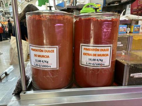 Két nagy üvegben illatos, édes murciai pirospaprika (pimentón dulce de Murcia) látható a valenciai piacon, Spanyolország egyik legkedveltebb fűszere a paellához és más mediterrán ételekhez. - Lantos Anikó fotója