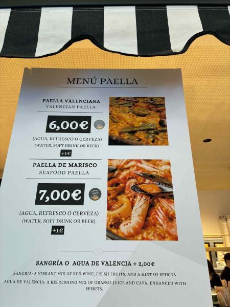 Valenciai étterem menütáblája, amely a híres paellát kínálja két változatban – hagyományos valenciai (paella valenciana) és tengeri herkentyűs palella marisco) formában. - L. Anikó fotója