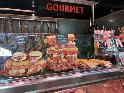 Valenciai piaci delikátpult ínycsiklandó bocadillókkal, melyeket híres ibériai sonkával, jamón ibéricóval töltöttek meg. - Lantos Anikó fotója