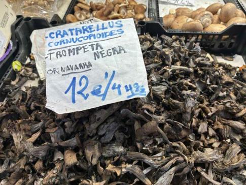 Navarra tartományból származó fekete trombitagombák (Craterellus cornucopioides) kínálata a valenciai piacon - Lantos Anikó fotója