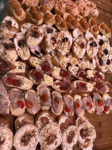Izgalmas tapasválogatás egy piaci pulton, apró bagettszeleteken különféle sajtokkal, sonkával, húsokkal és krémes feltétekkel. - -Lantos Anikó fotója