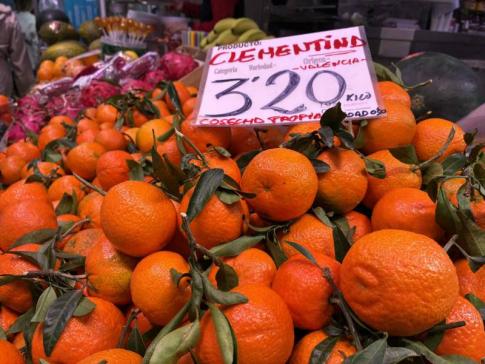 Valencia híres édes klementinjei (lényegében mandarin) frissen kínálva egy helyi piacon (3,20 EUR/kiló), a térség egyik legjellegzetesebb gyümölcseként - Lantos Anikó fotója (2025)