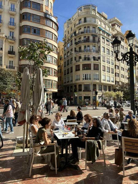 Vasárnap délelőtti reggelizés Valencia belvárosában, a Plaza del Ayuntamiento környékén (A háttérben látható köríves homlokzatú, art deco stílusú épületek tipikusak erre a térre.) - Lantos Anikó fotója